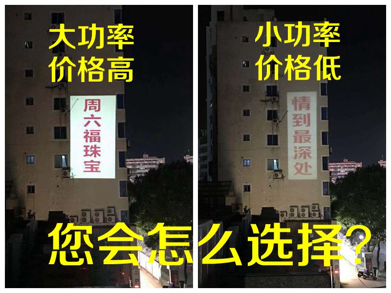 一、产品功率:尽量选择功率大一点的产品,投影灯看的就是效果,功率越大亮度越高,效果越好。但不同家产品功率不具有对比性,比如A家的50W产品可能只有B家产品30W的亮度。(原因大家自己去想)