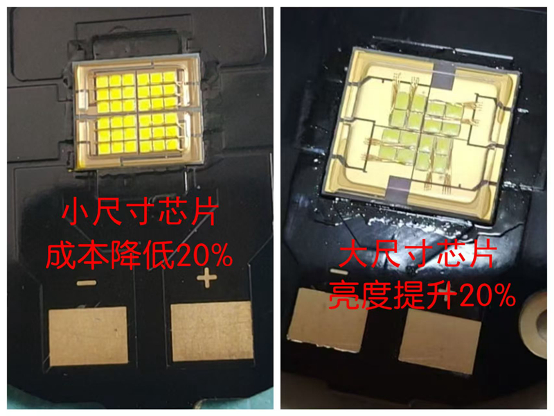 八、采用德国欧司朗大芯片的LED光源,同样的功率,亮度却比普通小芯片LED光源高出20%